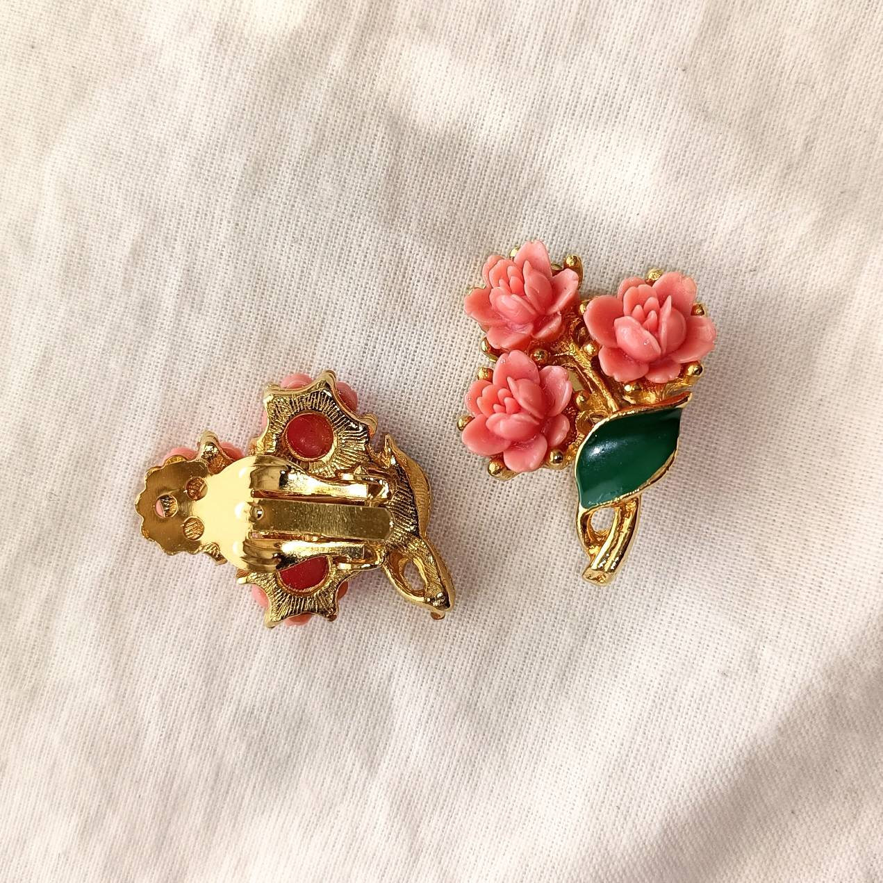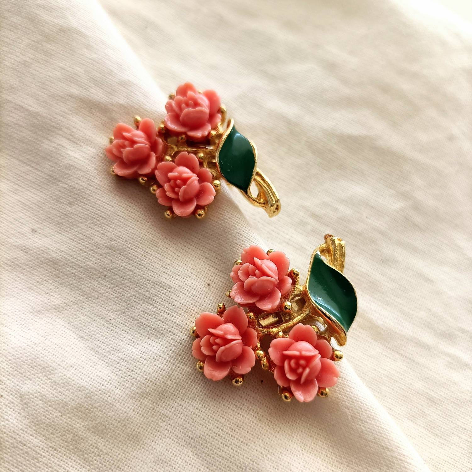 Vintage floral demi parure with an intertwining of roses on the bracelet, taken up in the clip earrings. In gold-plated metal, the flowers are made of resin or synthetic material while the green leaves are enameled.